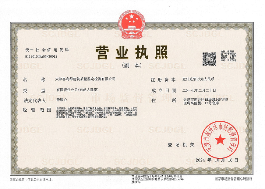 天津喜利得建筑質量鑒定檢測有限公司于2017年2月在天津市市場和質量監督管理委員會南開區市場和質量監督管理局注冊成立。于2018年8月18日取得天津市住房和城鄉建設委員會頒發的建設工程質量檢測機構資質證書。